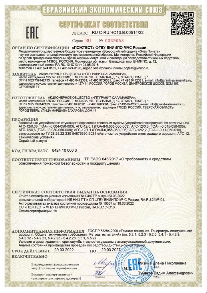 Сертификаты Генератор огнетушащего аэрозоля АГС-12/0,1, V=0,1 м³