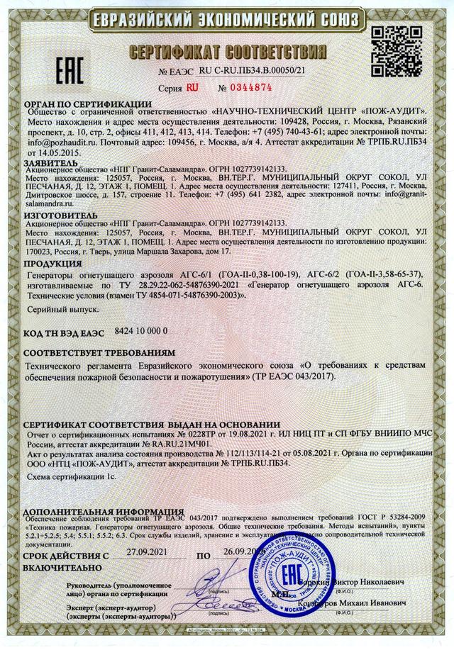 Сертификаты Генератор огнетушащего аэрозоля АГС-6/2 АГС-6/2, V=52 м³