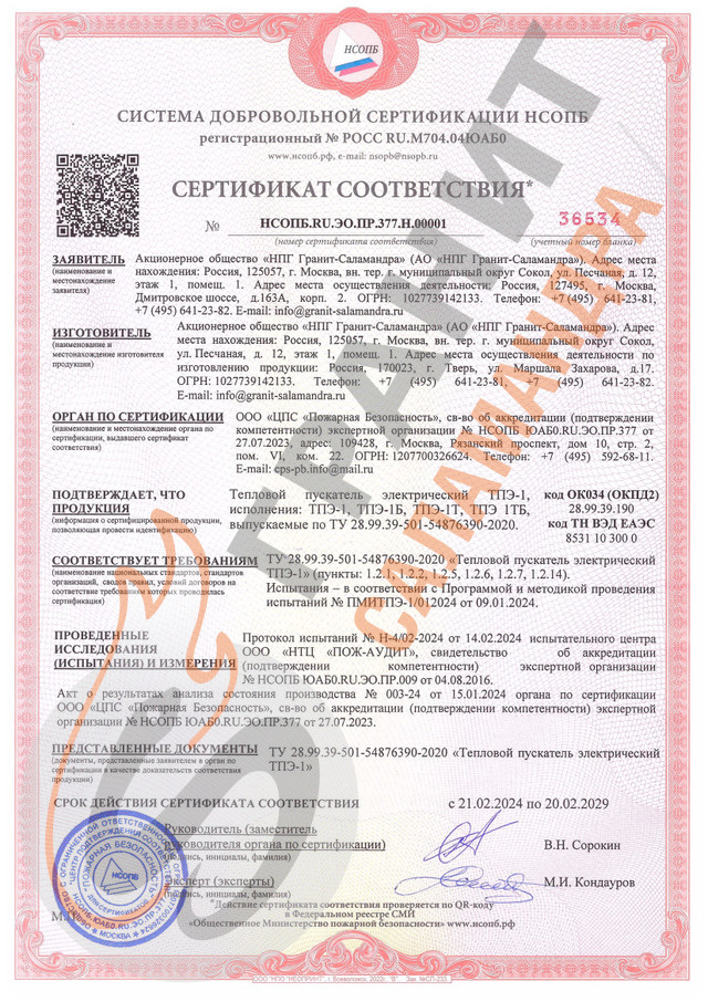 Сертификаты ТПЭ-1Б (68°С), тепловой пускатель эл. (с элементом питания) (для АГС)