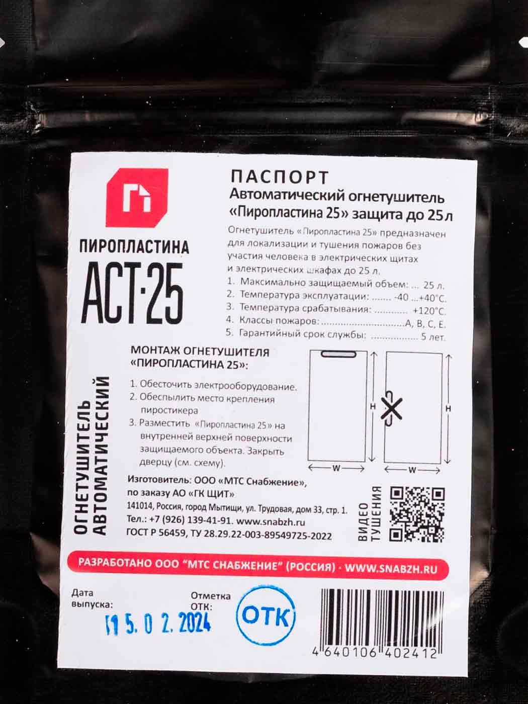 «ПироПластина АСТ-25» предназначена для установки внутри распределительных щитов, сейфов и других малогабаритных конструкций с целью защиты имущества от пожара. Устройство срабатывает при достижении температуры 100-150 градусов и обеспечивает защиту объема до 25 литров.