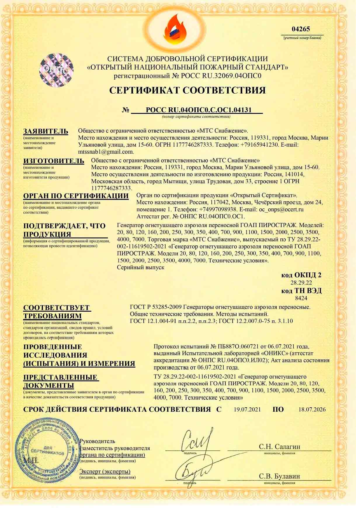 Сертификаты ГОАП Пиростраж 01-2 (на 200 литров, 0,2 куб.м)
