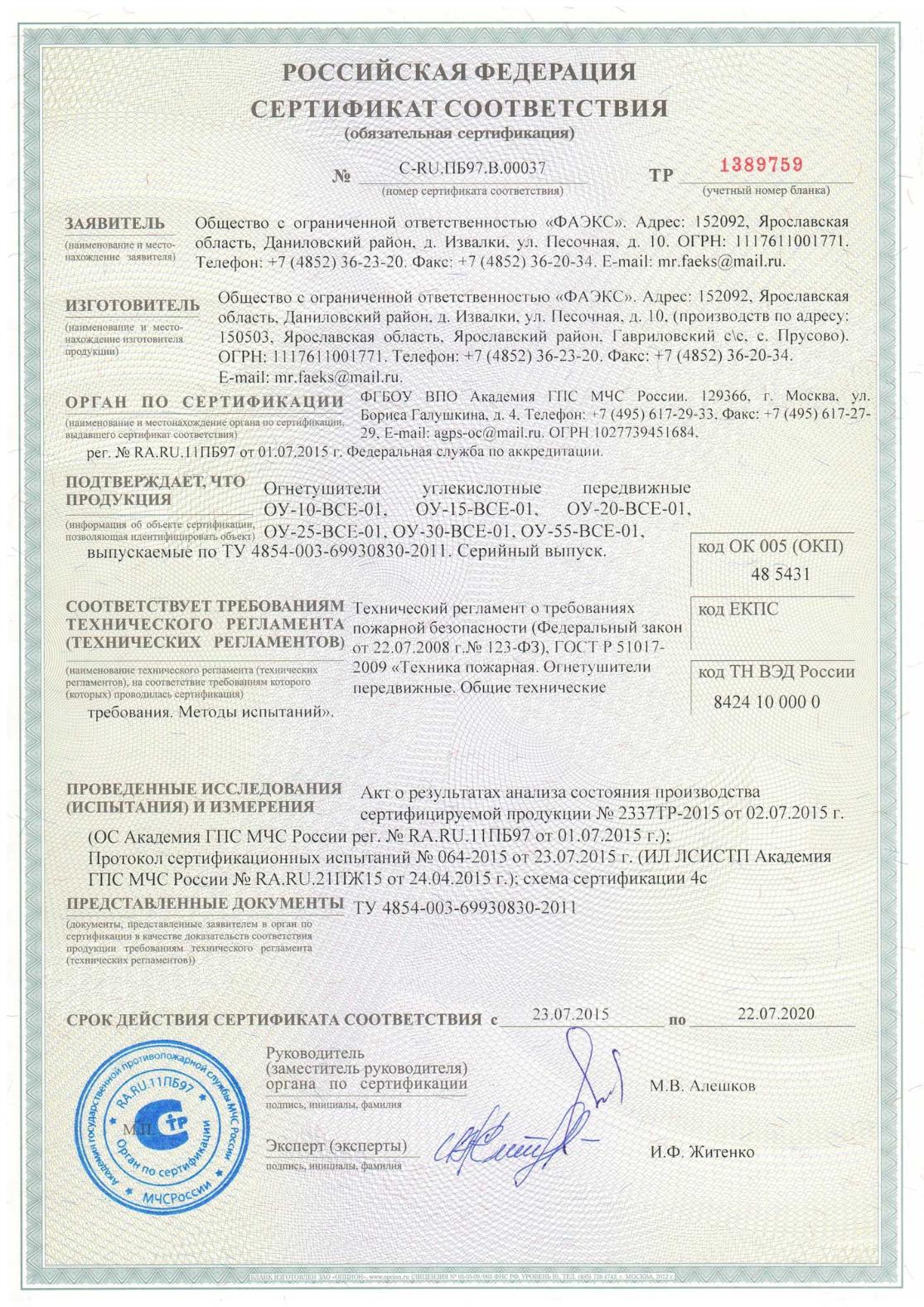 Сертификаты Огнетушитель углекислотный ОУ-10 ФАЭКС