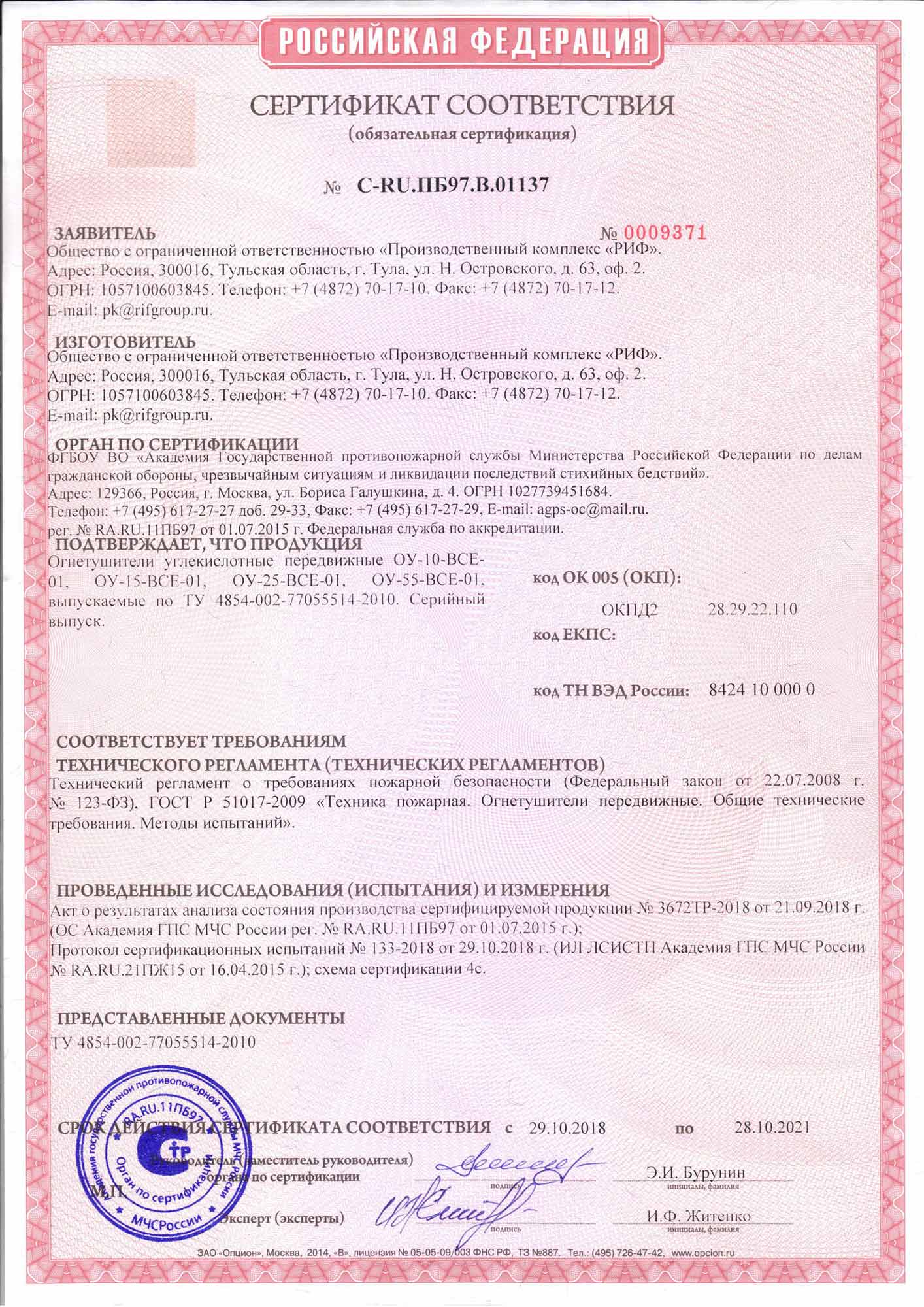 Сертификаты Огнетушитель углекислотный ОУ-20 РИФ