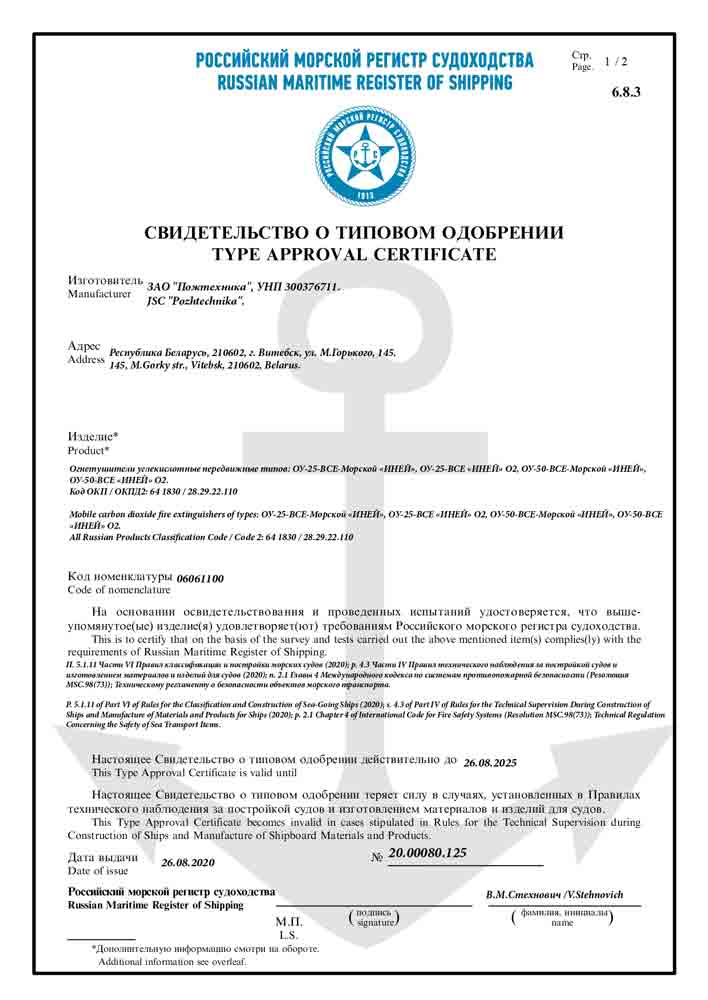 Сертификаты Огнетушитель углекислотный ОУ-50-ВСЕ Морской ИНЕЙ (144В,С,Е)