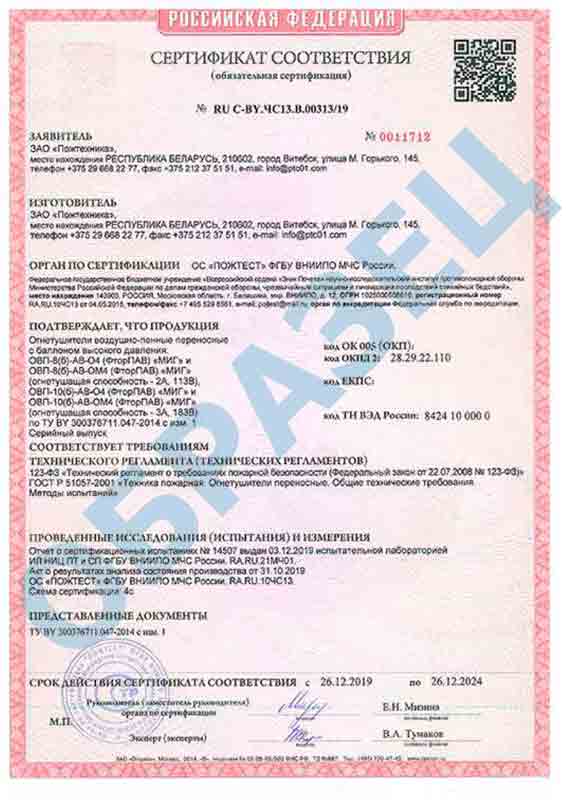 Сертификаты Огнетушитель воздушно-пенный ОВП-10(б) МИГ (ФторПАВ) (3А, 183В) летний