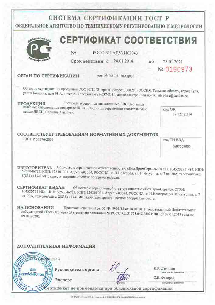 Сертификаты Лестница веревочная спасательная ЛВС (30 м) в сборе с сумкой и карабином