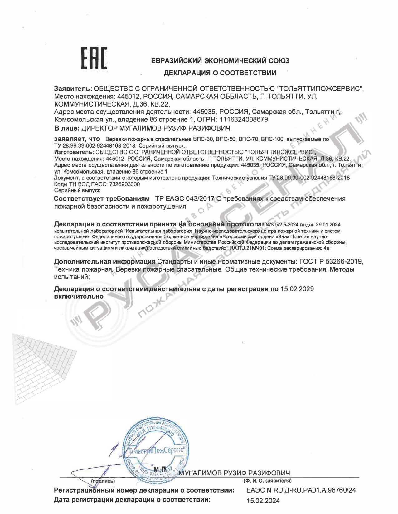 Веревка ВПС-100 применяется при проведении спасательных операций как на открытой местности, так и в помещениях. Изделие изготовлено из полиамидной веревки, концы которой оформлены термостойкой трубкой и оснащены металлическими коушами. Веревка ВПС-100 соответствует требованиям ГОСТ 53266-2009 и может эксплуатироваться в температурном диапазоне от -40 °С до +50 °С.