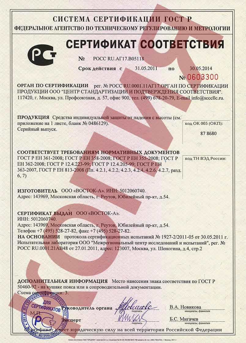 Сертификаты Удерживающая привязь УП 1 А (строп лента)