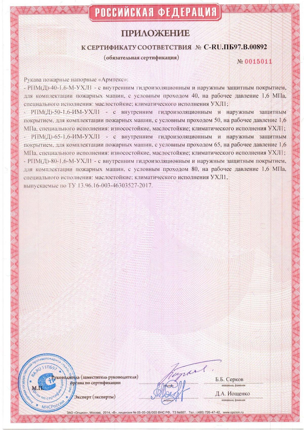 Сертификаты Рукав пожарный 65 мм Армтекс 1.6 МПа с головкой ГР-70ал и стволом РС-70.01ал (20±1м)