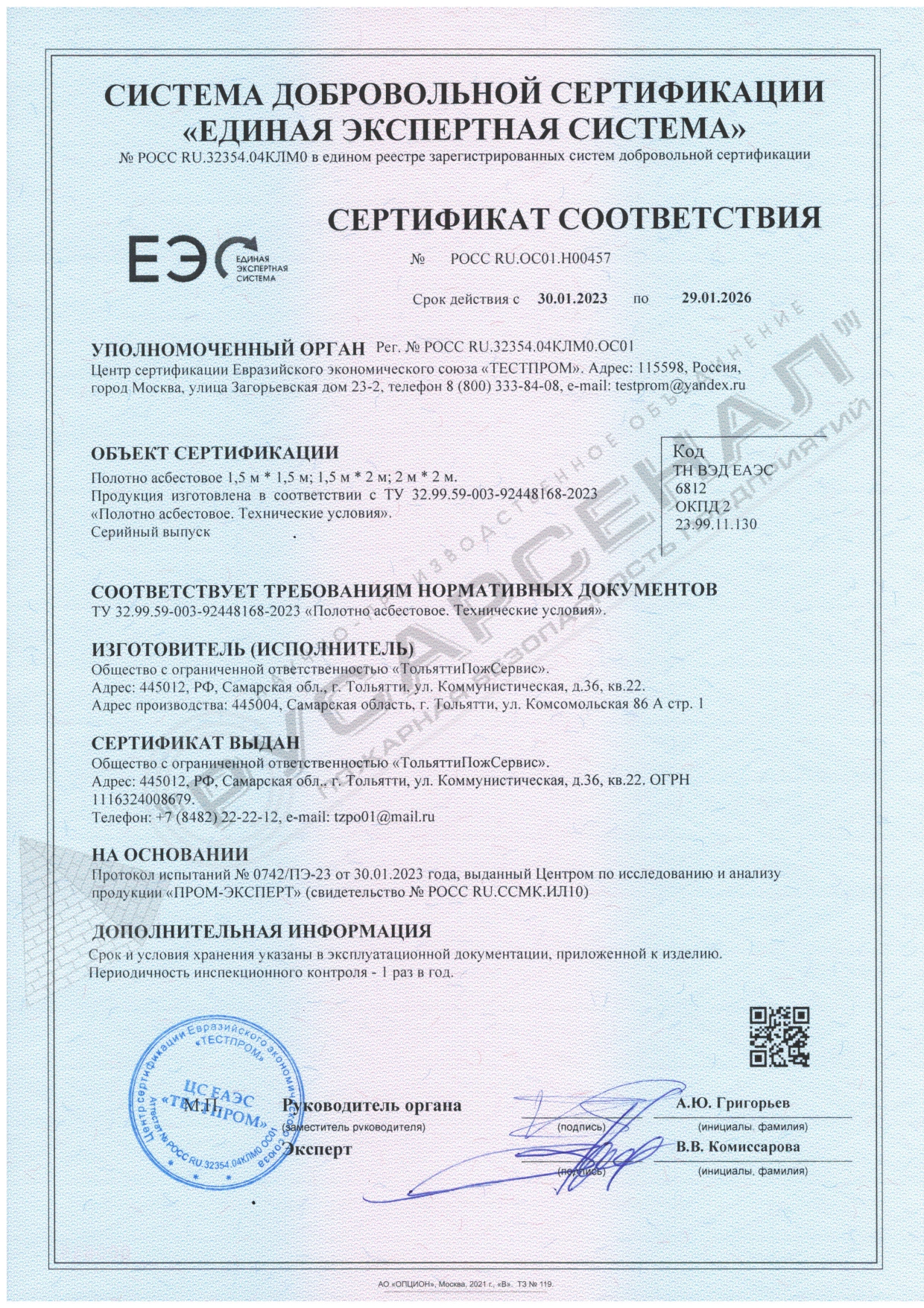Сертификаты Противопож полотно ПП-1200