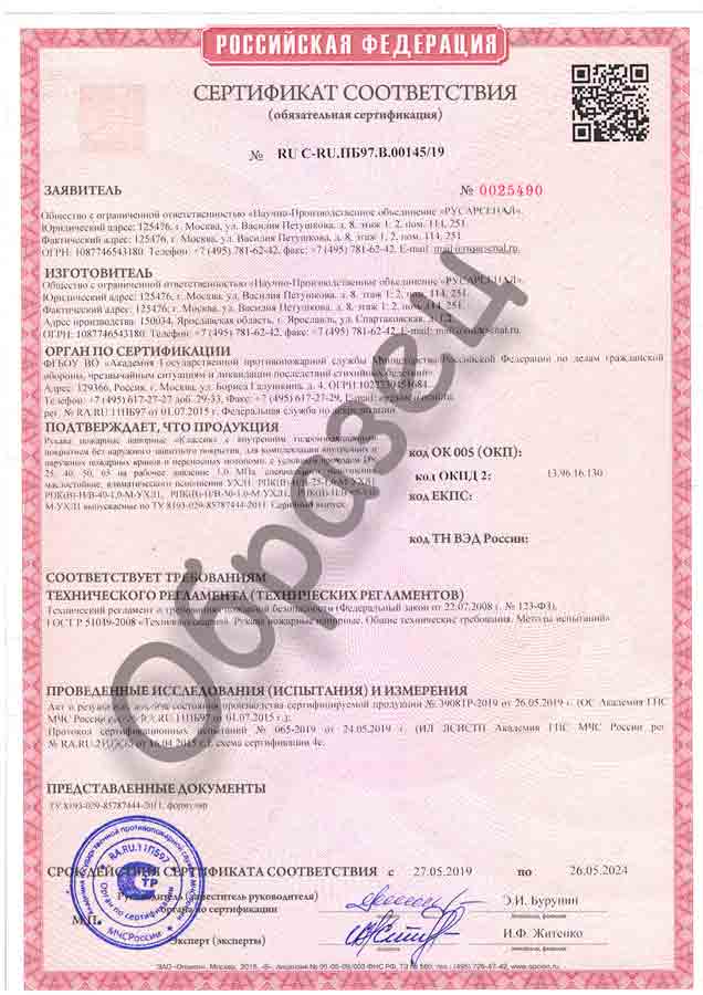 Сертификаты Рукав пожарный 50 мм "Классик" с головками ГР-50пл (10±1м)