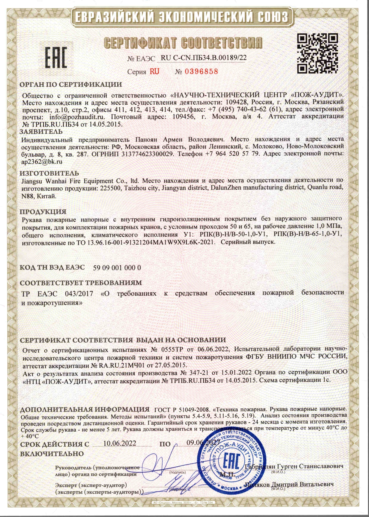 Сертификаты Рукав пожарного крана 50 мм 1.0МПа с головкой ГР-50а-пл и ручным стволом РС-50,01ал (20±1м) КНР
