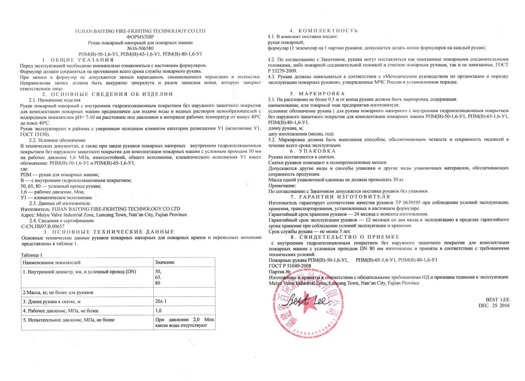Сертификаты Рукав пожарный 50 мм "Стандарт" 1.6МПа с головкой ГР-50ал и ручным стволом РС-50,01ал (20±1м) КНР