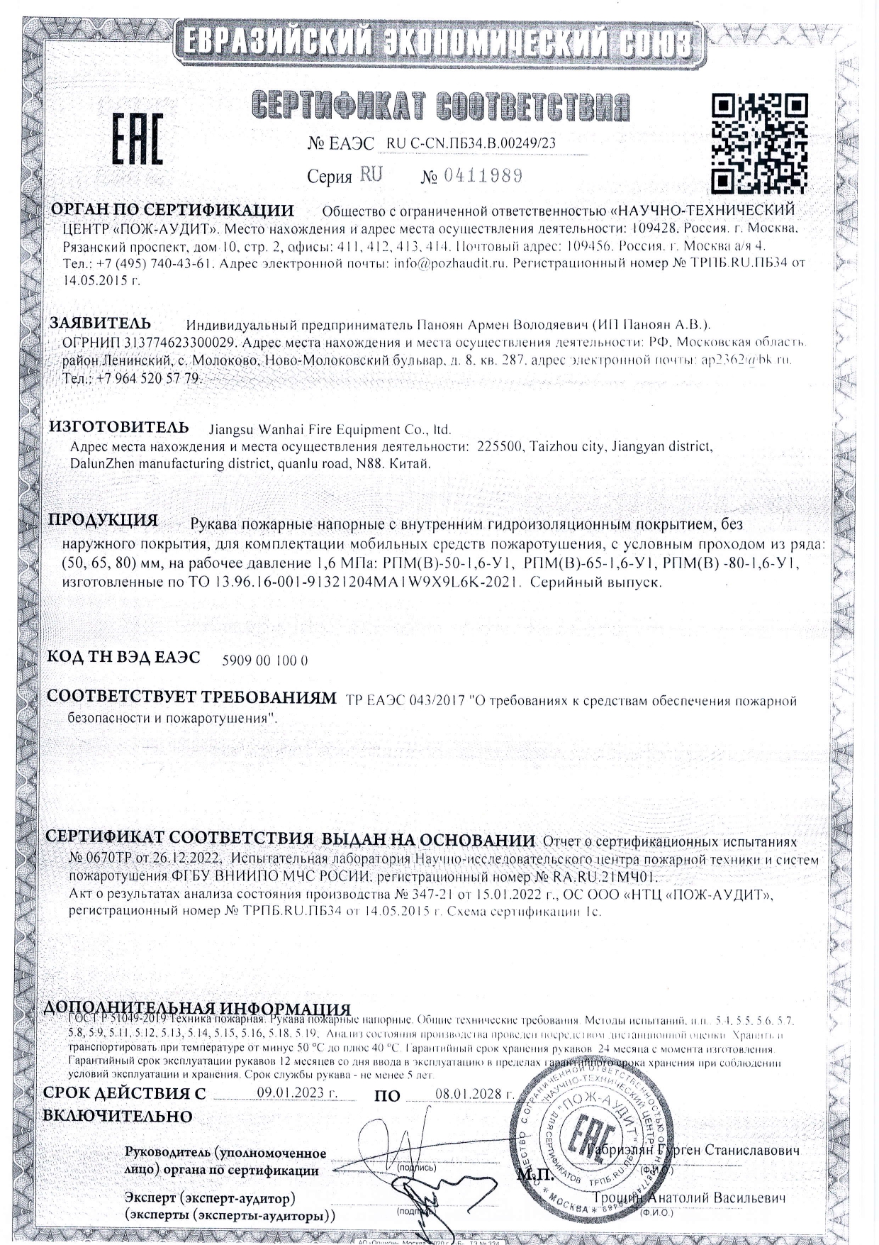 Сертификаты Рукав пожарный 80 мм "Стандарт" 1.6МПа без головок (20±1м) КНР